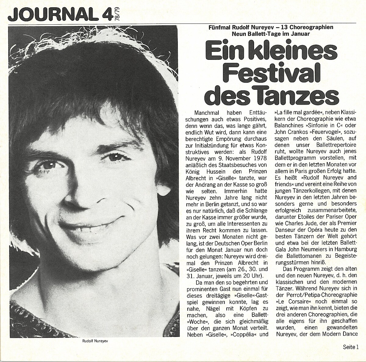Am 3. November bringt Rudolf Nurejew seine eigene Version von Der Nussknacker zur Premiere an der Deutschen Oper Berlin. Die erste Einstudierung seiner Fassung war am Königlichen Opernhaus in Stockholm (1967) herausgekommen, anschließend beim Royal Ballet in London (1968), an der Mailänder Scala (1969) und am Teatro Colón in Buenos Aires (1971). Für Berlin entwarf Nicholas Georgiadis eine opulente Ausstattung. Dramaturgisch werden in dieser Version Drosselmeyer und Nussknacker-Prinz von ein und demselben Tänzer verkörpert, selbstverständlich tanzte Rudolf Nurejew die Doppelrolle zur Premiere selbst. Als Clara gastiert Merle Park. Sie hatte diese Rolle 1968 mit Nurejew für dessen Nutcracker beim Royal Ballet in London erarbeitet.