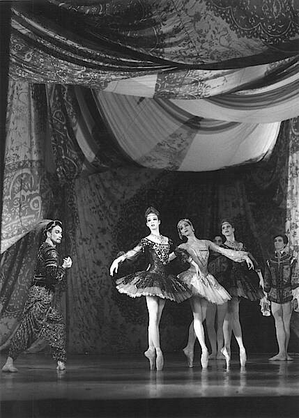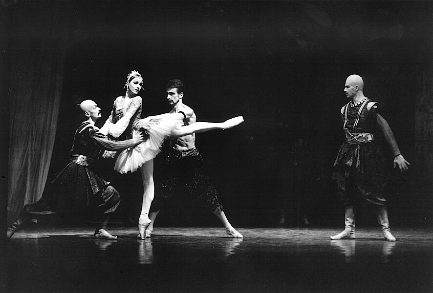 Raymonda (Ausstattung: Nicholas Georgiadis) an der Staatsoper Unter den Linden 1994: [1] Torsten Händler (Abderachman) mit Beatrice Knop, Bettina Thiel und Barbara Schroeder [2] Bettina Thiel (Raymonda), Oliver Matz (Jean de Brienne) und Damen des Corps de ballet in den prachtvollen Tutus von Nicholas Georgiadis [3] Bettina Thiel und Oliver Matz [4] Bettina Thiel (Raymonda) und Torsten Händler (Abderachman) [5] Bettina Thiel (Fotos Marion Schöne)