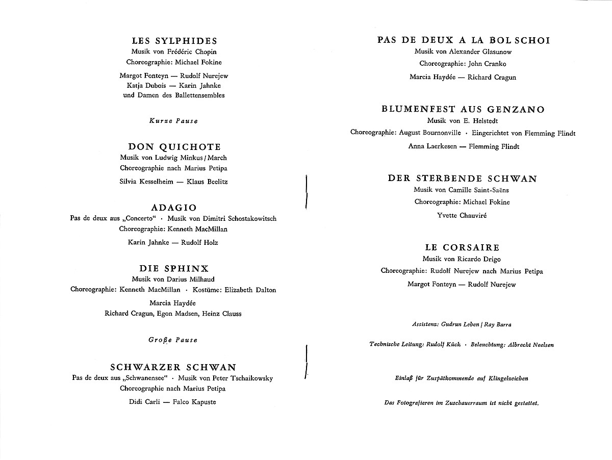Margot Fonteyn, Rudolf Nurejew, Marcia Haydée, Richard Cragun, Yvette Chauviré, Flemming Flindt und die Ersten Solotänzerinnen und Solotänzer der Deutschen Oper Berlin: Zu einem Gala-Abend im Rahmen einer Ballettwoche sind gleich einige große Stars der internationalen Ballettszene auf der Bühne der Deutschen Oper Berlin versammelt, Gert Reinholm und Kenneth MacMillan laden sie ein, um dem Berliner Publikum die glamouröse Seite des Balletts zu präsentieren. Das Programm spricht für sich. Nurejew und Fonteyn präsentieren nicht nur Fokins Les Sylphides mit dem Ensemble des Balletts der Deutschen Oper, sondern als finalen Programmpunkt auch Nurejews legendäre Fassung des Le Corsaire Grand Pas de deux.