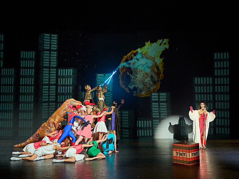 DWS Ich sehe mich selbst als Kind und deshalb mache ich Stücke, die ich gern sehen würde, die es aber so noch nicht gibt. In Chicxulub oder Der Floh des Teufels wollte ich eine richtig große Geschichte erzählen. Sie führt uns von Dinosauriern, klassischen Märchenfiguren über einer TV-Nachrichtensendung und sogar bis ins Weltall. Es ist ein bisschen wie ein Mix aus Computerspiel, Comic und Abenteuerfilm. Es ist eine tolle Erfahrung, mein ganzes Team mitzunehmen und meine Fantasie so zu teilen, dass sie lebendig wird. Auf der Bühne passiert fast alle paar Minuten etwas Neues: eine andere Szene, ein überraschender Twist, eine neue Figur oder ein Musikwechsel. Es soll aufregend bleiben, damit keine Sekunde langweilig wird.